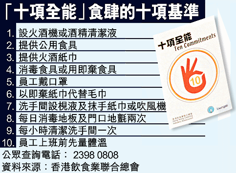 香港飲食業聯合總會會長張宇人昨稱,「十項全能」活動於五月至八月舉行,現已接受報名,名額一千個。參與食肆會獲煤氣公司贈免觸式酒精消毒機及紅外線耳溫計,讓顧客洗手及量體溫,而食肆須做足十項措施(見表),並張貼貼紙標示。市民可透過黃頁網頁搜查十項全能食肆。