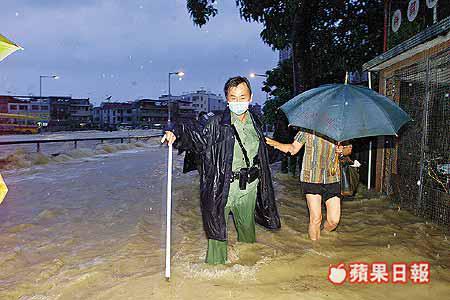 【本報訊】受到一道低壓槽帶來的雷雨影響,天文台昨日清晨起發出今年首個紅色暴雨警告,為新界北部地區帶來百年一遇的驚人豪雨。水浸黑點錦田及打鼓嶺一帶又再出現水浸。有區議員批評渠務署的排水渠,只足夠應付十年一遇的大雨,有需要提高標準。