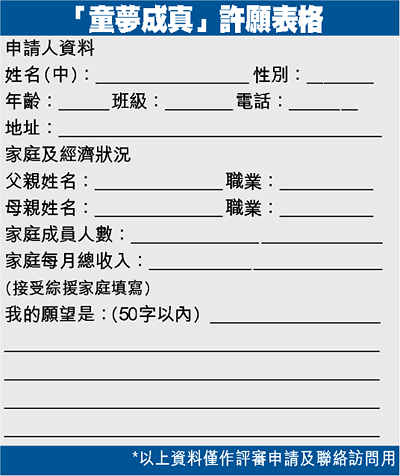 如你家孩子有心願待償,請填妥「童夢成真」許願表格,傳真或寄交:將軍澳工業邨西駿盈街八號蘋果日報慈善基金收,信封註明「蘋果基金童夢成真」行動,待基金審核符合資格後,將盡力助孩子達成願望。查詢電話:29908688,傳真:23702192。