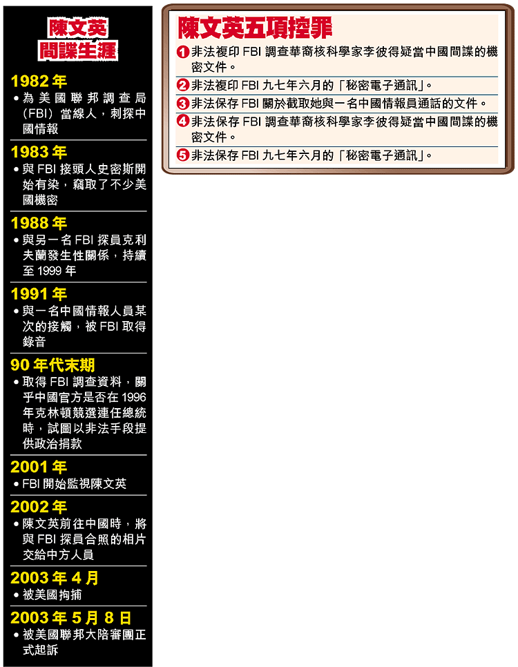 檢察官指陳文英為FBI當中國情報線人十八年,共收到逾一千三百萬港元的酬金,但她卻與FBI接頭人史密斯有「不恰當性關係」,趁機竊取史密斯攜至她寓所的機密文件,複製後交給中國。為此令FBI由一九八二至二○○○年對中國的每項反間諜調查及行動,均受質疑。