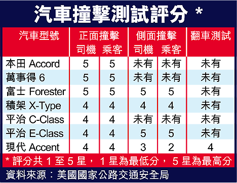 【本報訊】美國國家公路交通局昨公布最新汽車撞擊測試結果,本田Accord、富士Forester及萬事得6都獲最高的五星評分,司機及乘客在撞車意外中,嚴重受傷機會低於一成;現代Accent成績較差,乘客的頭部在意外中有嚴重受傷機會。