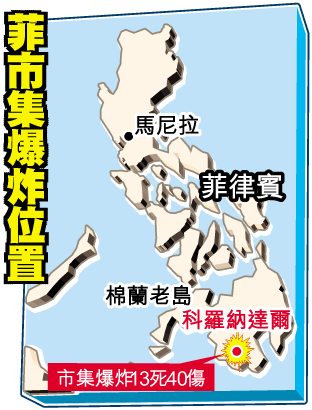 菲律賓南部棉蘭老島科羅納達爾市一個市集外上周六受到爆炸襲擊,一聲巨響後現場滿是死傷者,導致十三死、四十傷,死者包括兩兇徒。回教激進組織「阿布沙耶夫」已承認責任。