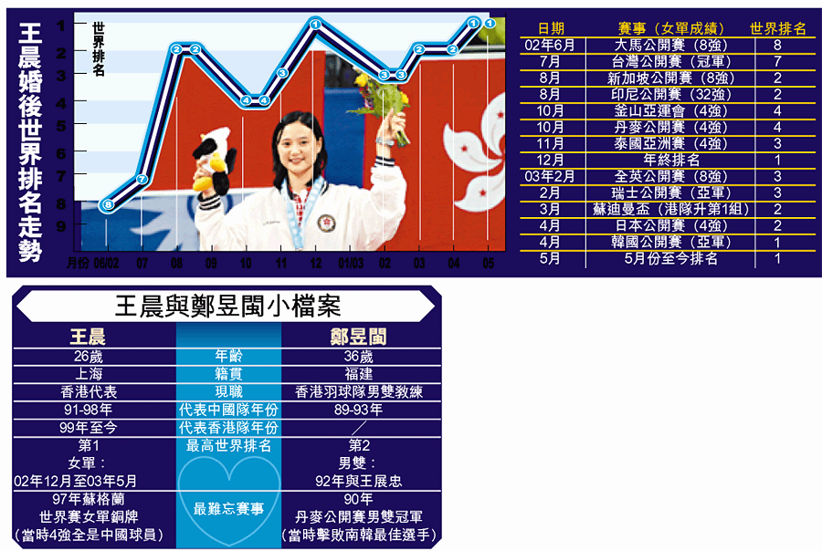 今個月剛好是王晨結婚一周年。她的「周年紀念」願望,不是要生多少個兒女,而是要多拿大賽錦標,而且要快,因為時間無多。一年前嫁給相戀十年的中國羽隊隊友鄭昱閩後,王晨的成績猛進,她也承認:「結婚後好安穩,讓我更能投入比賽。他在我身邊,幫我不少!」 文:徐嘉華圖:陳亮華