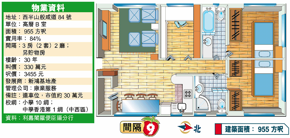 全屋無窗台,窗戶又大,套房皆有兩扇大窗,特別光猛通爽。加上單位樓層夠高,前臨低矮的英皇書院,廳房向西北視野開揚無阻,西區樓群錯落有致。利嘉閣周雲霞表示,物業10樓以上單位,享有開揚景觀,高層單位樓價貴逾20%,如目前一個低層B室,開價僅250萬元。