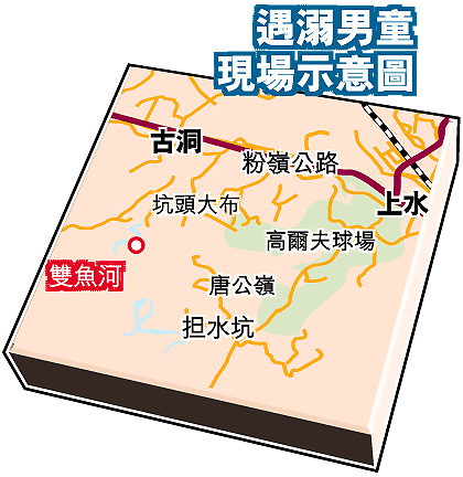 溺斃男童的現場,位於粉錦公路唐公嶺通往長瀝村的一段雙魚河。村民稱,上址年多前進行過河道工程,鋪設石屎河床,改善了河底淤泥阻塞的情況。該段雙魚河經擴闊工程後,河道寬逾四十呎,水深不逾兩呎。村民說,本月五日的一場豪雨,河水狂漲、水淹農田,至個多星期前,發現河底的河床被沖垮,河底滿是淤泥,河中央水深約九呎。「我哋打電話叫渠務署快啲嚟維修,但係遲遲都冇人嚟。」