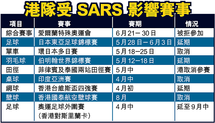 香港體壇在非典型肺炎陰影下,接連受到影響(見表)。最新受害者是香港奧委會會長霍震霆及一班智障運動員。前者被多哈拒絕入境,參加今日的亞奧理事會執委會;後者被拒參加四年一度、下月二十一至三十日在愛爾蘭舉行的「○三年特殊奧運會夏季世界比賽」。港隊已採取一系列避炎措施,希望愛爾蘭有關當局最終收回成命。 記者:體育組、何文雯、經濟組