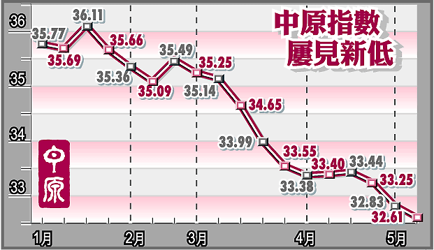 【本報訊】中原城市領先指數再創新低,本月截至11日的一周報32.61點,較前周跌0.22點。指數已連續第三周出現下跌。相對今年1月5日一周的35.77點,跌幅達8.8%。
