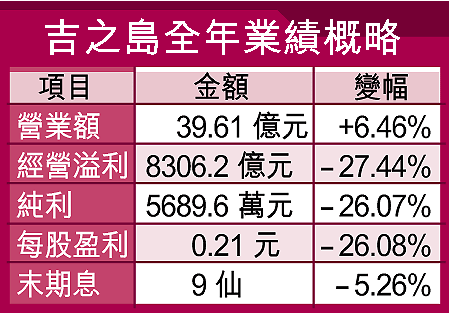 吉之島去年度營業額39.61億元,微升6.46%;每股盈利0.21元,減26.08%。末期息每股派9仙,較上年度同期減少0.5仙(見表);全年計則因較早前沒有派發中期息,下跌21.74%。