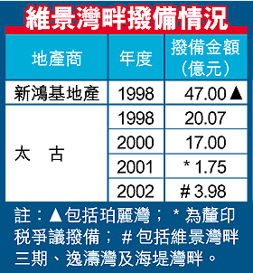 不過,摩根士丹利出席新地管理層與機構投資者聚會後指出,由於本港住宅樓價繼續下滑,預期新地極大機會在今個財政年度(03年6月底止年結)為維景灣畔、馬灣珀麗灣及東涌海堤灣畔撥備合共8.9億元。撥備後,維景灣畔每方呎成本將降到2400至2500元。目前該盤呎價約3000元。太古(019)在今年3月公布業績時,也為維景灣畔三期及東涌海堤灣畔等,作出減值近4億元。