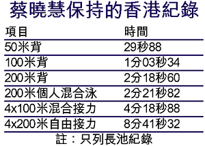「蔡領校隊奪冠」,這是香港泳手蔡曉慧現就讀美國加州OrangeCoastCollege官方網頁上的頭條標題;報道中強調「很少一年級新生可以像蔡曉慧般,在一個泳賽中有旋風般的表現。」曉慧其實之前已在上月的全美泳賽中,她個人刷新港百米背泳紀錄,更成為香港首位達到明年雅典奧運標準的泳手;而美國著名學府柏克萊大學的泳隊教練更看中蔡曉慧,力邀她入讀該校。 文:徐嘉華
