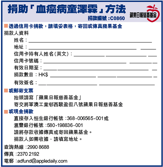 「上次手術唔成功,澤霖好唔開心,我都喊咗好多日,𠵱家佢有時會頭痛、流鼻血、喉嚨痛…成個人都好攰,冇精神玩。」憂心忡忡的譚太無奈地續說:「醫生話要快啲做第二次手術,因為老公比較大隻,所以會喺佢身體抽取骨髓,諗起呢次得兩、三成機會,真係好擔心,惟有見步行步。」