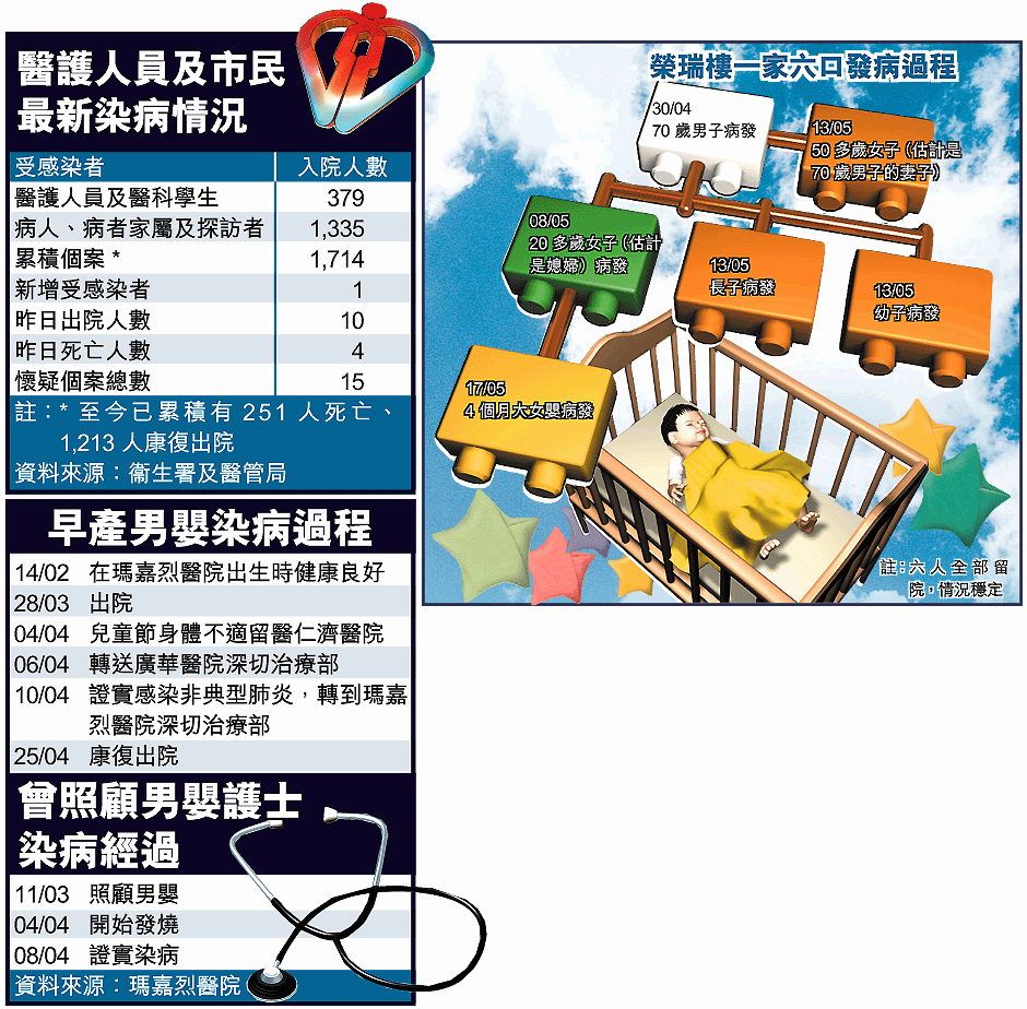 至於早前三名染上非典型肺炎的孕婦,剖腹產下的三名早產嬰,至今仍無證據顯示他們經母體傳染,其中在瑪嘉烈醫院治療的一名嬰兒日前已出院,另外兩名仍在威爾斯親王醫院留醫。