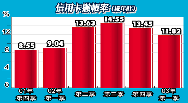 【本報訊】首季按年度計的信用卡撇帳率,由於仍未全面反映疫症的影響,故一如市場預期,從去年第4季的13.45%下跌至11.82%,是連續第二個季度下跌。由於銀行收緊信貸及客戶減少消費,首季應收帳款總額較對上季度跌7.9%,至545.67億元。雖然部份銀行表示,近期假日的客戶消費簽帳,已回復至3月份疫症前水平,但恐難抵銷4月份的萎縮,故在應收帳持續減少下,料會帶動第2季撇帳率回升,惟升幅應不會太大。