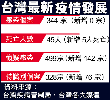 綜合台灣媒體報道,台灣昨日應再有五名懷疑或證實的沙士病人死亡,令死亡人數升至四十五人,當中一人據報是台北和平醫院的男醫護人員,但衞生署拒絕證實新增死亡數字,指當局最快到今日才公布。