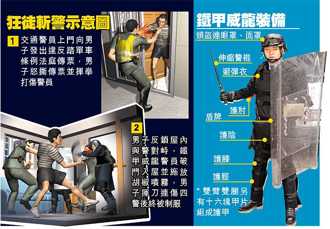 因為違例踏單車的法庭傳票,青衣昨爆發戰況激烈的警民血戰,兩名穿着全套保護衣的「鐵甲威龍」警員連同兩名同袍衝入屋企圖制服頑抗的戶主時,雙方在烏燈黑火的環境下「困獸鬥」,結果四名警員被斬傷,傷警的怒漢最後亦被制服。 記者:陳日海、黃偉民、黃冠笙