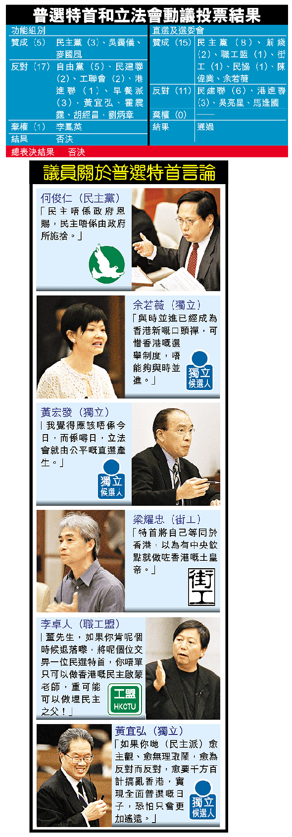 動議最後在多數直選及選委會組別支持、大部份功能組別反對下,因未能同時獲兩組點票通過而被否決。