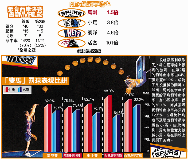 1.鄧肯一夫當關 –鄧肯兩戰以來可謂一夫當關,平均攻入三十六分及十五個籃板,投籃命中率更高達六成一,小馬對這位常規賽MVP確無可奈何;既然鄧肯有本事壓過湖人的奧尼爾,早階段在太陽夾擊下亦屢見佳作,難怪不少球評家認為小馬要勝馬刺要先勝鄧肯;再看小馬的奴域斯基第二戰上半場顯示的急躁,實未到鄧肯的級數。