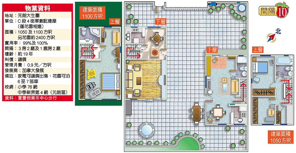 元朗錦綉花園物業實用率幾達百分之一百,面積約1000方呎,間隔分上下層加閣樓,地方見使好用。若是擁有毗連的兩座洋房,生活空間可倍增。現時放售的孖屋不超過10組,當中包括一種兩座洋房獨立分開,只是花園相連,這類間隔適合大家庭,成員可各自擁有私人空間。