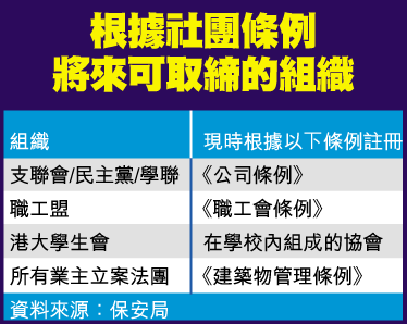 以往民主黨及支聯會等組織由於以《公司條例》註冊成立,政府要取締一間「公司」並不容易,也會引起社會震動。除了《公司條例》外,還有一些組織根據不同法例註冊,同樣不受《社團條例》監管(見表)。