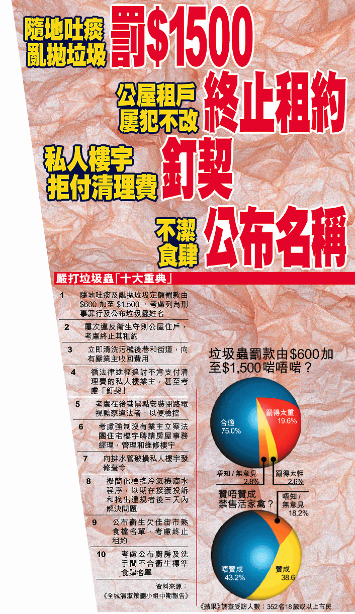 街上滿布垃圾、後巷污水長流、天井臭氣熏天……香港推行清潔運動數十年,始終未能改變缺德者的衞生觀念。一場「沙士」疫潮令清潔香港變得刻不容緩,由政務司司長曾蔭權領導的「全城清潔策劃小組」昨提出十大重典,嚴懲屢犯不改的垃圾蟲,日後隨地吐痰或亂拋垃圾,除了會被罰款一千五百大元外,更可能會被公開譴責甚至坐監。記者:謝明明、蔡建豪、陸羽平、倪清江