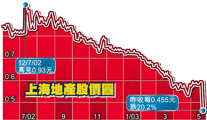 午市開市後,上海地產股價即一瀉如注,隨後更傳出周氏被扣的消息,該公司在新鴻基證券等證券行力沽下,跌勢甚急,最低見0.35元,跌幅達38.6%,及後傳聞被否認,股價才喘定,收報0.455元,仍跌20.18%。同系的上海商貿(1104)股價也大跌21%,收0.245元。上海地產傍晚發表的澄清聲明指出,該公司業務運營及財政狀況一切正常,周正毅現身處上海,於當地處理日常業務,該公司目前手頭現金仍有16億元。