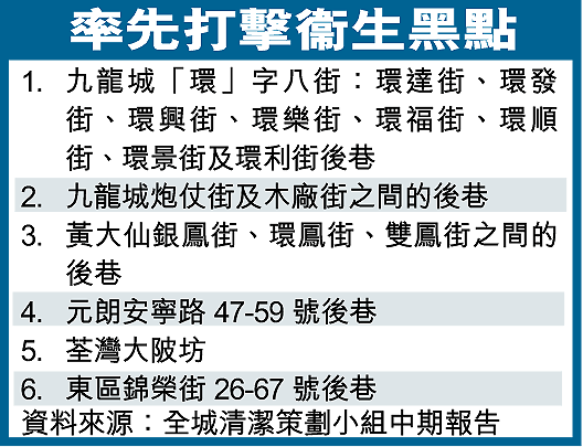 第一階段在本月至八月期間進行,清理九十九個屋邨,共二百五十八個衞生黑點,包括清理簷篷。同時派員清理大廈內堆積的垃圾,當局鼓勵居民利用電話熱線舉報垃圾堆積問題。