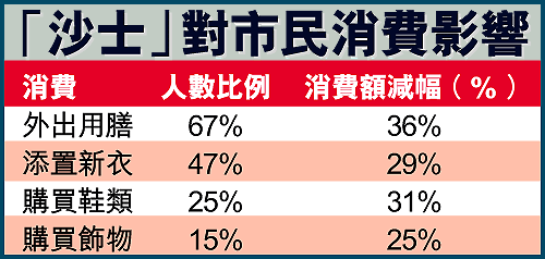 負責調查的AC尼爾森公司,上月以電話訪問了一千人,了解他們在疫潮高峯期的消費情況。除減少逛街的次數外,不少受訪者在外出晚膳、添置新衣及鞋類飾物的消費額均有所減少。其中三成四受訪者表示,在上月沒有外出晚膳;而沒有購買新衣的則有逾五成。調查又顯示,受訪者在上月的消費額,較在疫潮未爆發前減少約三成半。
