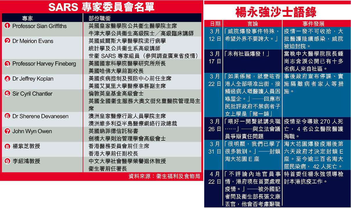 中國疫情失控,領導人怒炒失職京官;非典型肺炎在港奪去二百七十條寶貴性命,至今非但沒有官員承擔責任,特首還力排眾議,堅持委任問責局長楊永強統領「對事不對人」的專家委員會,檢討當局處理疫潮的表現。對於楊永強「自己查自己」,淘大業主代表直言:「盞嘥工夫。」難令死者家屬信服。楊永強卻聲言:「唔係我做邊個做呢?」 記者:陳沛敏、徐岱靈、蔡建豪
