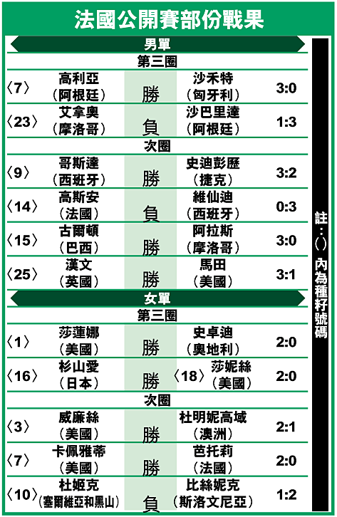 【綜合法國外電】衞冕女單冠軍的美國球手莎蓮娜在周五的法國網球公開賽盡顯實力,在女單次圈只用了四十分鐘,就送給奧地利的史卓迪十二隻蛋,以直落兩盤六比○勝出,晉身十六強。