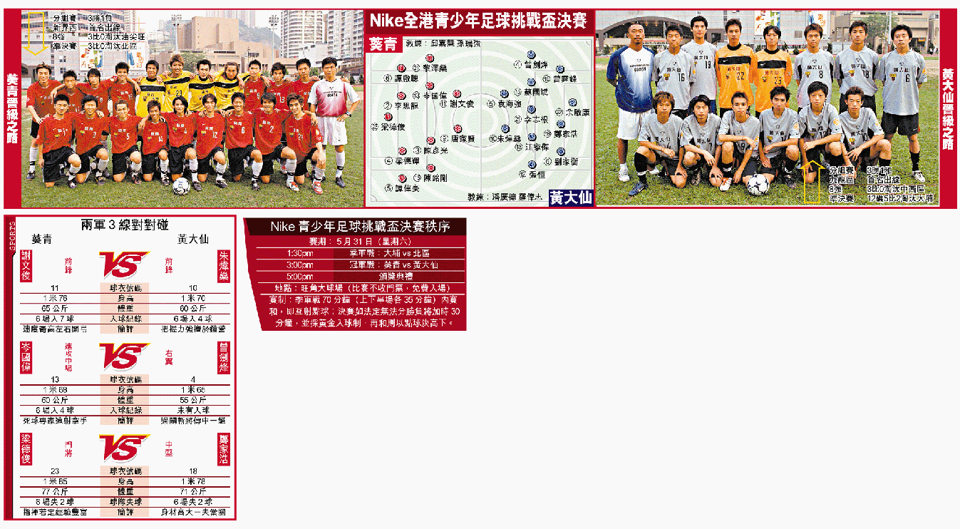 擁有多名學界代表及甲組後備球員的葵青,今午三時在旺角球場上演的「地區足球隊訓練計劃暨Nike全港青少年足球挑戰盃」決賽,強勢進攻,求挫「奇兵」黃大仙,奪取冠軍。