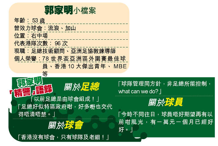 郭家明,香港足球圈無人不識的名字,他在球員時代屢建奇功,做教練又擅於調兵遣將,贏得「郭指導」、「智多星」的美譽。足總去年底邀請郭家明任足總擔任技術顧問,希望藉他的足球知識及經驗,能助港足運「逃出生天」,可是要醫治「千瘡百孔」的香港足運卻不是易事,要改進更是步步為營。
