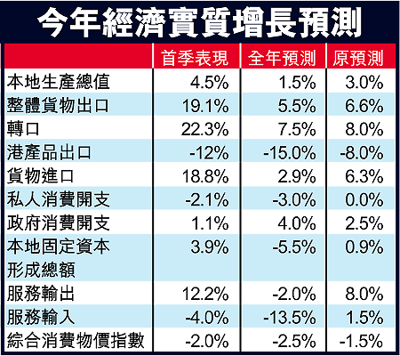 雖然非典型肺炎的疫情開始緩和,但後遺症陸續浮現,港府昨日將全年經濟增長預測由原來的百分之三,調低至百分之一點五;國際貨幣基金及恒生銀行亦調低其預測。至於首季經濟增長受到半個月疫情影響,扭轉連升七季的氣勢,較去年第四季微跌。 記者:莫劍弦、羅偉光、譚暉