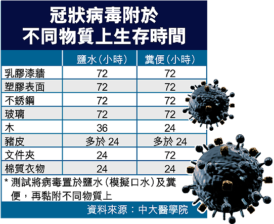 【本報訊】中文大學醫學院昨日發表對新冠狀病毒的最新研究結果,發現病毒分別在糞便和「模擬飛沫」的鹽水中,再黏附在不同物質的表面上,可生存二十四至七十二小時。其中,以在乳膠漆牆壁、玻璃、塑膠和不銹鋼表面等平滑面上,生存時間最長,無論在鹽水或糞便中,都可生存三天。