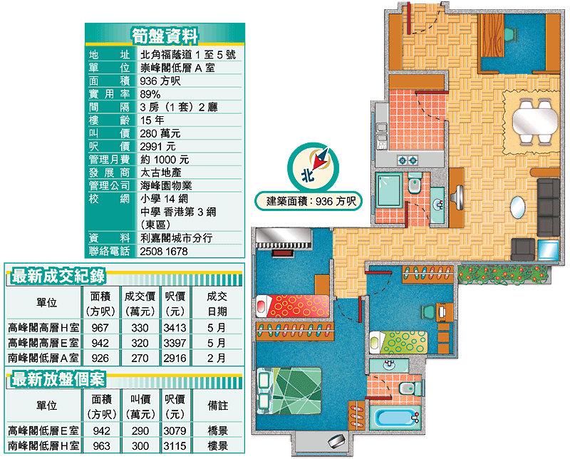 北角海峰園景觀,可分望樓及海景兩大類,樓景市價較為實際,每呎毋須三千元。筍盤位處低層望內園,賣2991元,開價貼市。面積936方呎,三房連套房,較其他兩房七八百呎更加見使,因而較受歡迎。