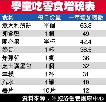 【本報訊】本港學童體重超標嚴重,原來學童常作為零食的薄餅、薯片及雪糕等,是導致他們肥胖的「幕後黑手」。營養師說只要每日吃半個薄餅,學童一年就會暴增六十四磅;每日一杯雪糕,一年會增加三十一磅;每日十片薯片,一年就增加十二磅,同時會增加糖尿病、心臟病機會。 記者:馮永堅