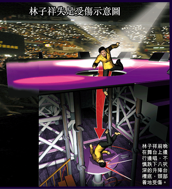 【本報訊】被譽為樂壇長青樹的林子祥「阿Lam」,前晚獲邀擔任汪明荃演唱會的表演嘉賓,結果在高唱一曲《男兒當自強》期間,在舞台中央失足跌落八呎下的升降台槽,並且一度昏迷,事後被送往九龍法國醫院救治。