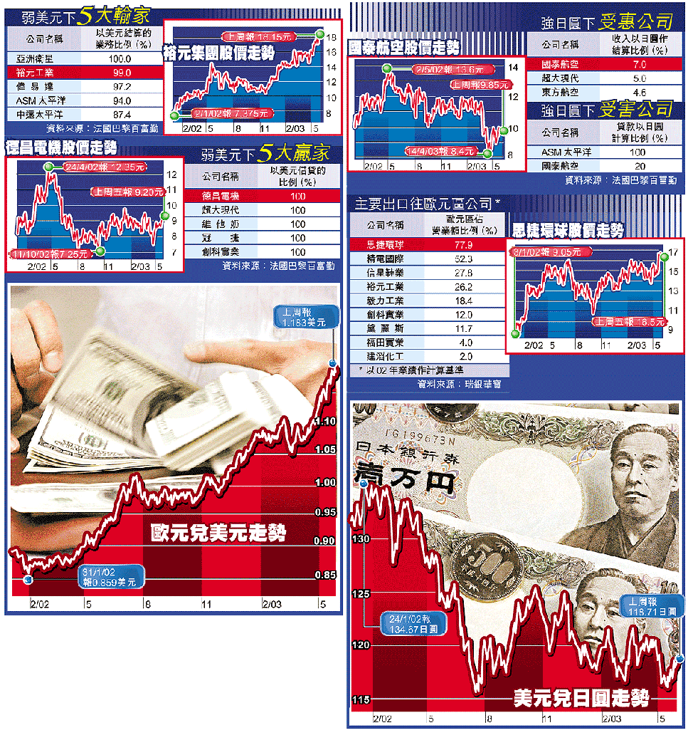 除了有業務在歐元區的公司能受惠於弱美元外,法國巴黎百富勤認為,有日圓收入的公司亦可得益。該行表示,其中最大得益者為仍然受非典型肺炎所困擾的國泰航空(293),因該集團約有7%收入是以日圓作結算;超大農業(682)亦有5%。