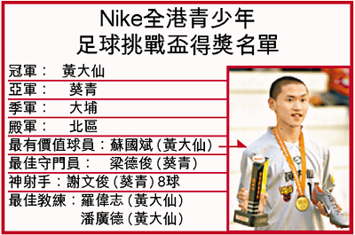 【本報訊】黃大仙昨午在旺角球場上演的「Nike全港青少年足球挑戰盃2003」決賽,憑互射十二碼以總比數五比三擊敗十人應戰的葵青,奪得今屆賽事的冠軍。