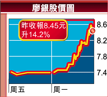 【本報訊】在市場傳聞大股東廖創興企業(194)將聯同第二大股東中遠太平洋(1199),放售廖創興銀行(1111)股權的消息下,廖銀股價昨天大幅飆升14.2%,即1.05元,至8.45元,最高曾見8.6元,全日成交金額達1243萬元。