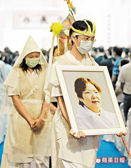 喪禮在香港殯儀館舉行,靈堂掛了很多蓉媽最愛的蝴蝶蘭。她的遺照是一、兩年前在天安門廣場清晨時分拍攝的,有晨光照臉,靈堂設計師說,這是象徵亡魂將會走向光明的往生路。
