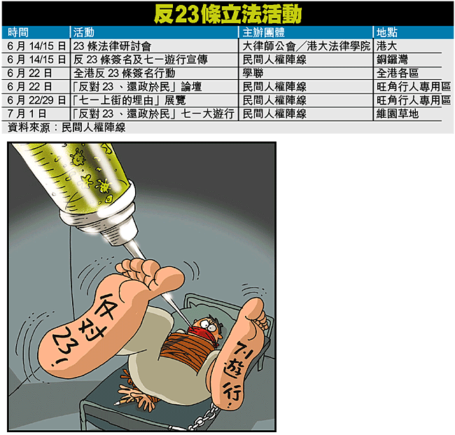【本報訊】民間反對《基本法》第二十三條立法行動已踏入最後抗爭階段。代表四十多個團體的「民間人權陣線」昨呼籲港人要掌握自己的命運,參加七月一日的「反對二十三、還政於民」大遊行;職工盟立法會議員李卓人更會破天荒在議會提出動議,要求以立法會名義號召全港市民出席七一大遊行。他堅信:「若果有十萬、二十萬、五十萬、甚至一百萬人上街,我唔信阻止唔到為二十三條立法」。 記者:莫劍弦
