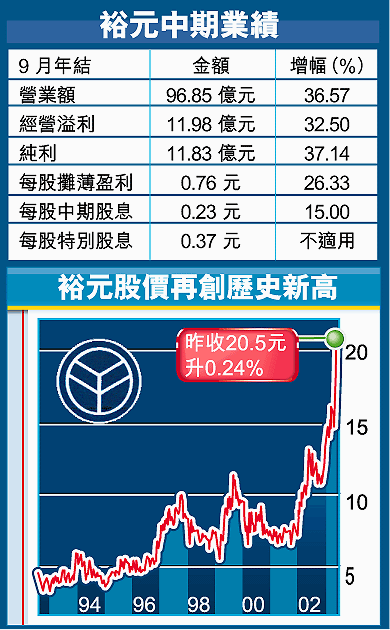 裕元截至03年3月底,6個月營業額96.85億元,較上年度同期升36.57%;每股攤薄盈利0.76元,升26.32%;並派發中期息每股0.23元,及特別股息每股0.37元(見表)。