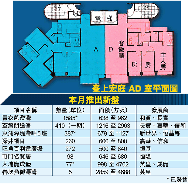 【本報訊】本月多個大型新盤陸續登場,樓市氣氛轉趨熾熱,繼青衣藍澄灣後,由長江實業(001)等發展的荃灣朗逸峯緊接推出,長實表明,最快下周公布定價及開放示範單位。業內人士預期,以本月新盤走勢,銷量可達2800伙,較預期多一成二。