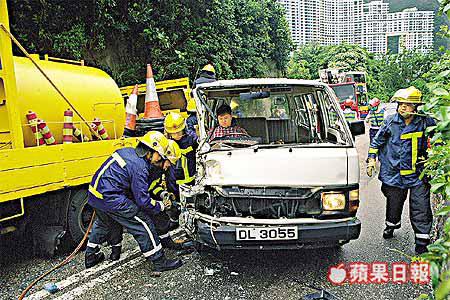 昨晨十一時許,姓馮(二十八歲)男子駕駛屬於志願機構的客貨車,沿淺水灣道上斜,途至淺水灣道九十九號一個右彎時,疑因天雨路滑致跣胎失控越過對面線,當時兩輛工程車正落斜駛至收掣不及,造成三車連環相撞。