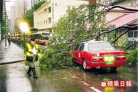 此外,昨午二時許,西環域多利道近西寧街路邊一棵十五米高、約半米直徑粗的大樹,疑受狂風暴雨吹打,突然連根拔起倒塌亘貫馬路,姓黃的士司機剛巧駕車經過,的士遭大樹的樹枝壓着車頂,幸他無被壓傷自行報警。警方事後通知有關部門到場鋸樹清理。