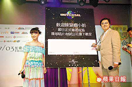 陳慧嫻昨日於新世界中心舉行「陳慧嫻珍演唱會」記者會,贊助商之一恆藝珠寶送上一套價值四百萬的鑽飾給她。而慧嫻亦於記者會上進行簽約儀式,她與環球唱片公司簽下三年合約,合共出三張唱片,環球唱片公司總裁陳少寶亦送上一對水晶蝴蝶祝賀對方加入公司。