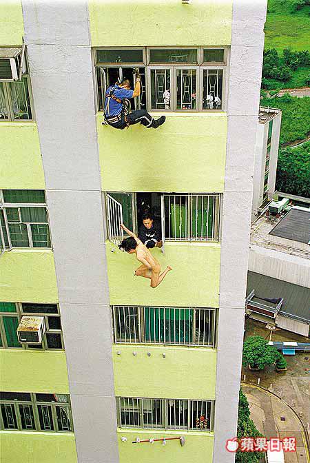 【本報訊】「燒死阿爸,燒死阿媽,好熱呀!快啲入嚟救我」,一名全身赤裸男子,在彩雲邨甘霖樓二十四樓住所燒報紙縱火,並危坐窗台企圖跳樓,與消防、警方對峙半小時後,當消防準備拯救時,他一躍而下直墮下二樓平台,當場死亡。