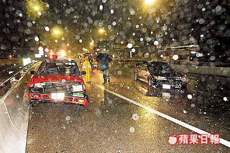 此外,昨深夜十一時四十分,青馬大橋亦在滂沱大雨下發生車禍。一輛往大嶼山方向行駛的私家車,由一名四十歲的女司機駕駛,在駛至青馬大橋收費廣場時懷疑車輛突然「死火」停下,女司機下車檢查,此時,兩名青馬大橋的職員上前協助。
