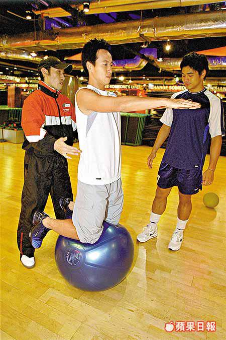 初級動作:挺胸收腹,雙腳蹲在健身球,不用扶手保持平衡狀態十秒以上。