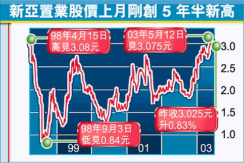 不過,有分析員認為,市場不必過份憧憬大股東會德豐(020)將於短期內私有化新亞。法國巴黎百富勤地產分析員顏偉洪便指出,在私有化憧憬下,新亞股價近日已經創出近5年半新高(見圖),大股東不會選擇在股價高企時提出私有化建議。